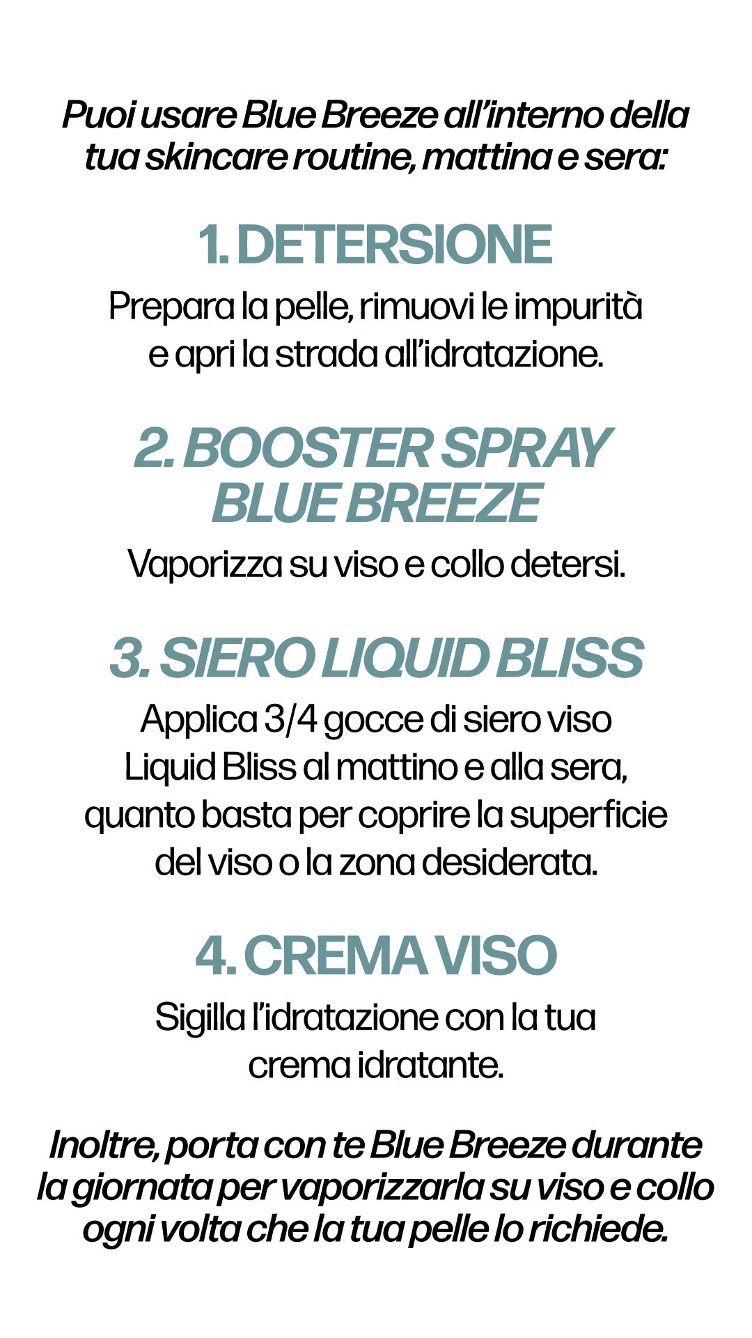 Blue Breeze on the go è il booster spray tascabile ideale per una pelle fresca e idratata in ogni momento della giornata. La sua formula è studiata per offrire idratazione immediata e contribuire all’equilibrio cutaneo attraverso l’azione combinata di attivi mirati.