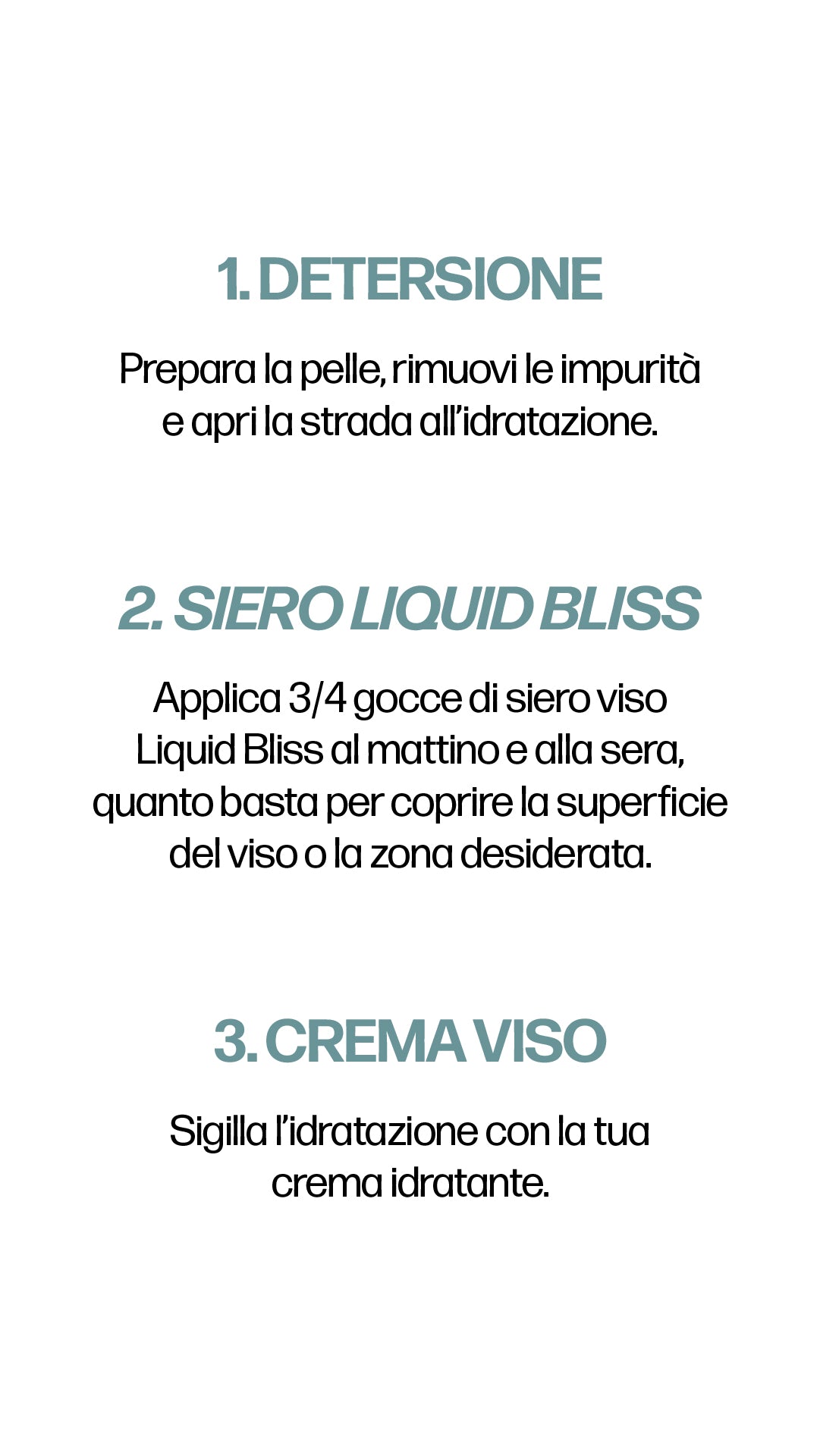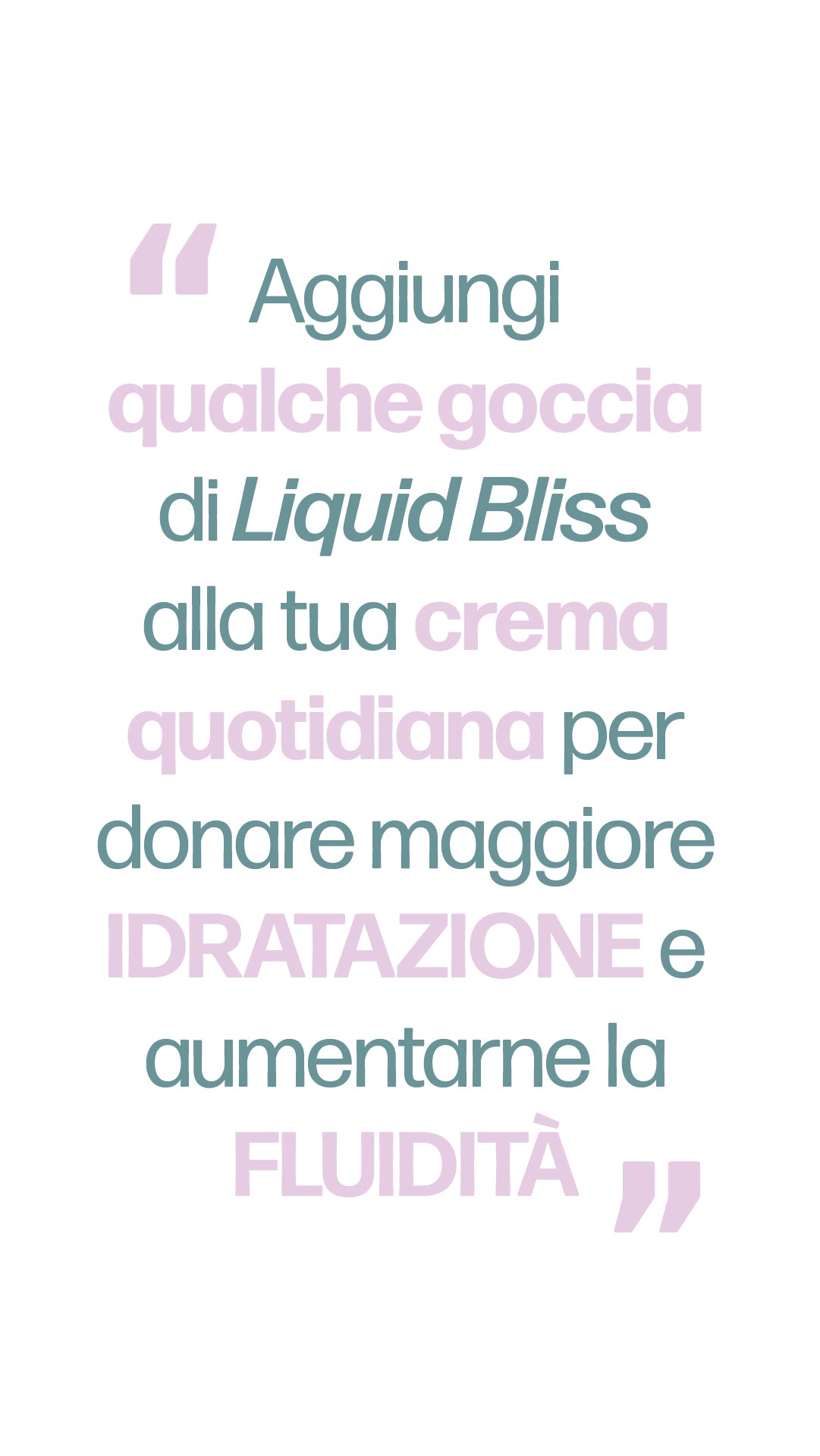 Liquid Bliss presenta una texture leggera che si assorbe rapidamente; con ogni applicazione la barriera cutanea si rafforza e l’incarnato ritrova una luminosità e vitalità naturale.